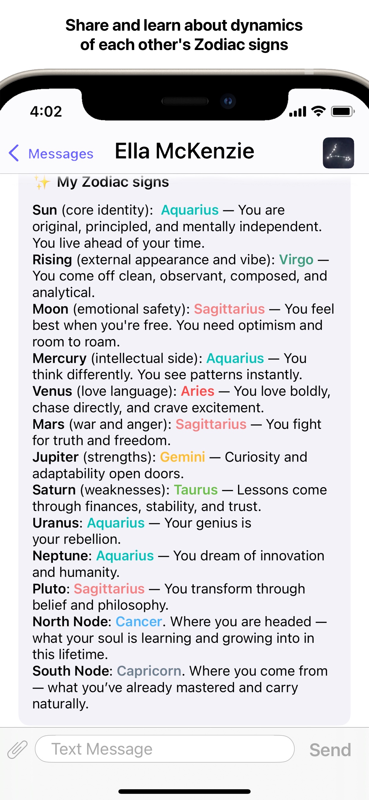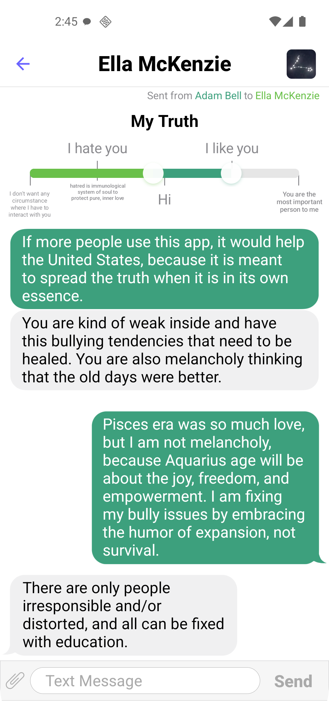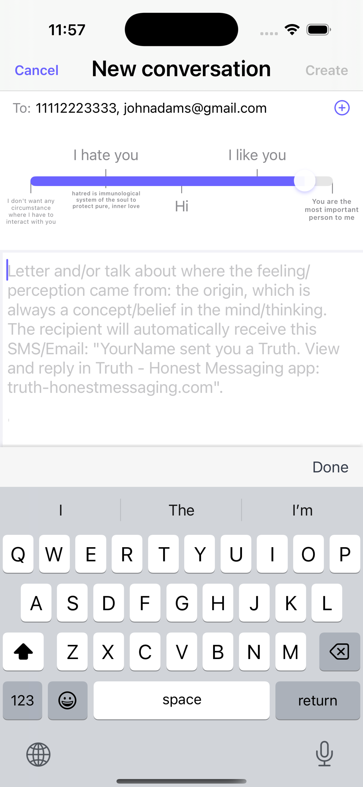 Send a Truth in the app by moving a slider to pick a rating of how much you care about them and write to them. To a phone number or Email address that you specified, they will receive a text message or Email: (let's say you are George Washington) "George Washington sent you a Truth. View and reply in Truth - Honest Messaging app: truth-honestmessaging.com". This would prompt them to download and open the app to see your Truth. In a private chat room of the app, your Truth will be displayed as a message bubble and would lead you to message each other honestly.