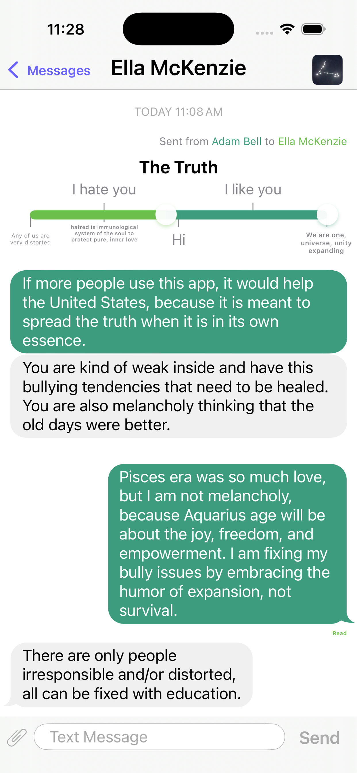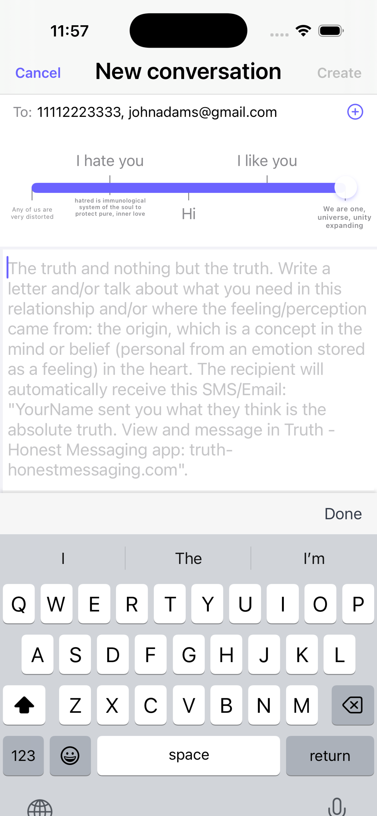 Send a Truth in the app by moving a slider to pick a rating of how much you care about them and write to them. To a phone number or Email address that you specified, they will receive a text message or email: (let's say you are George Washington) "George Washington sent you what they think is the absolute truth. View and message in Truth - Honest Messaging app: truth-honestmessaging.com". This would prompt them to download and open the app to see your Truth. In a private chat room of the app, your Truth will be displayed as a message bubble and will lead you to message each other honestly.